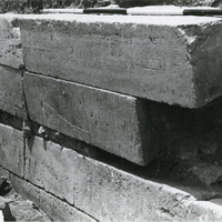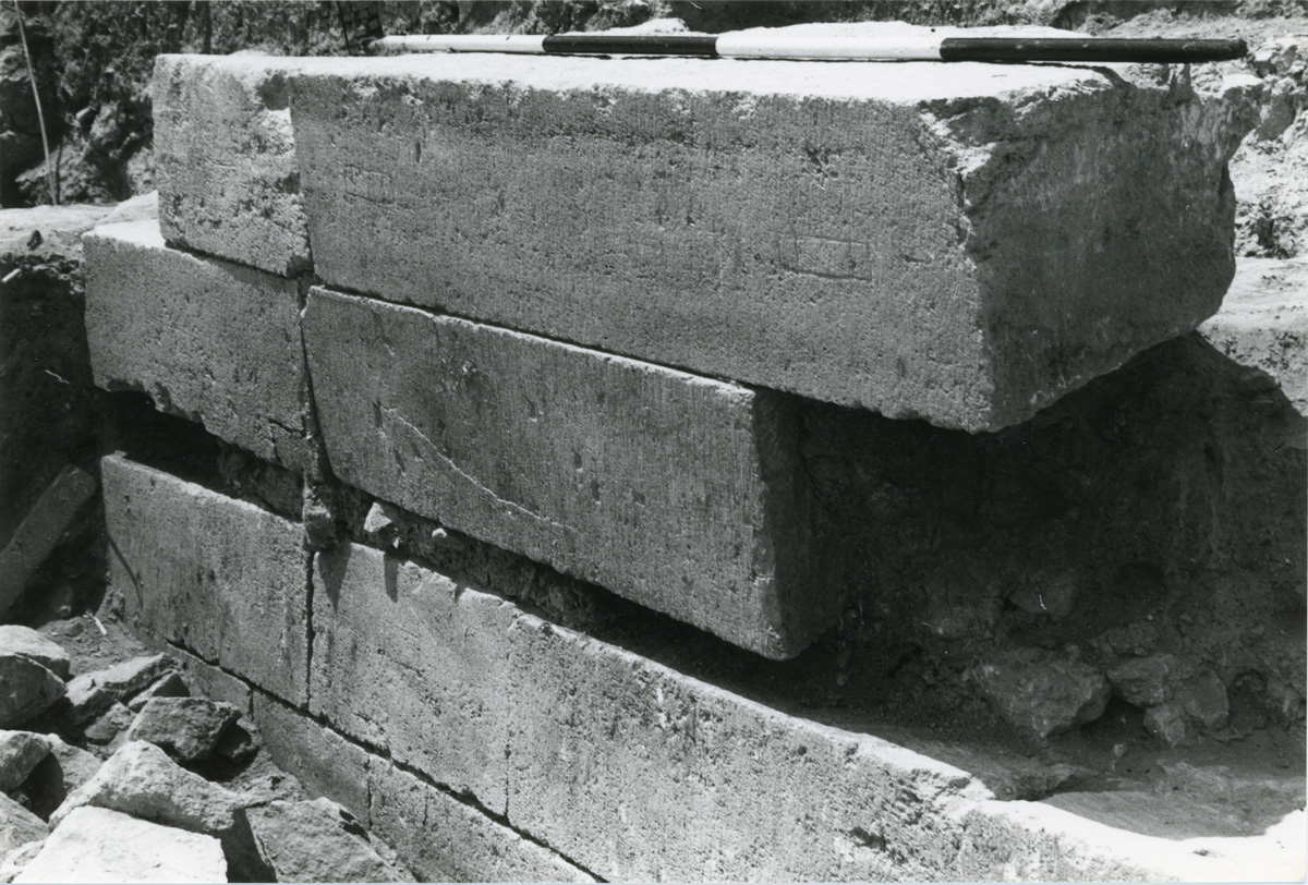 - Excavation photo, Pillar Hall, canted upper west wall before reconstruction. In publication, Plate 29a.