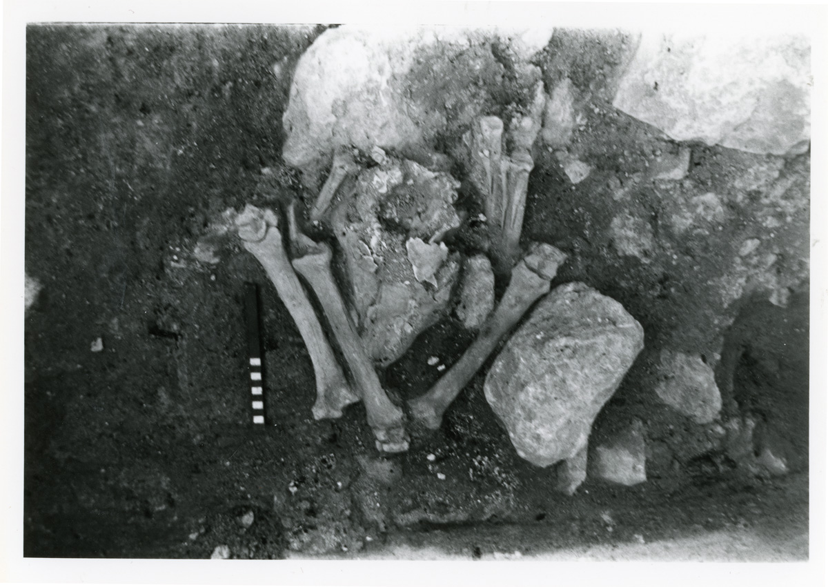 - Excavation photo, Pillar Hall, donkey bones.In publication, Plate 30b.