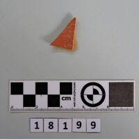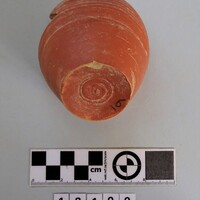 - Small jug with red slip. Exterior smoother decorated with grooves. Body part preserved with carved concave base. Handle attachment visible but handle missing. Two small sherds