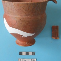 - Cup. Nearly complete. Fine orange clay. Semi-lustrous red glaze. Strap handle. Foot conical underneath with smear.
