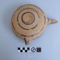 - narrow spout. Surface polished inside and outside. Brown decoration (bands
