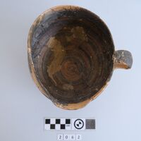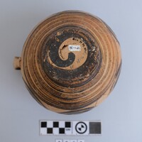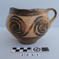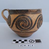 - spout at right angle to strap handle; dark brown to near handle black slightly lustrous paint on warm buff slip: running spiral between horizontal bands