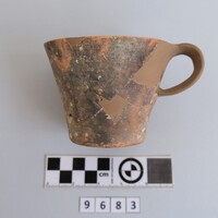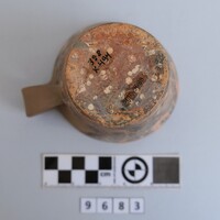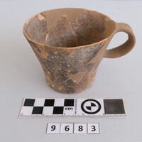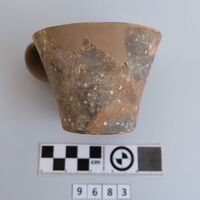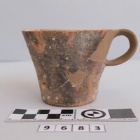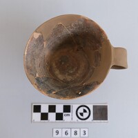 - Few small rim and side fragments and upper part of handle missing. Restored. Coated dark-brown throughout. Exterior has careful white spotting on side and underside. H.7cm; D. rim: 9.5cm; D. base: 5.4cm.