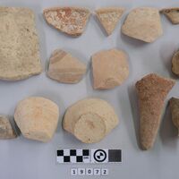 - one bell-shaped cup and one straight-sided cup base fragments. One goblet and a rim belonging to a rounded cup. Two flaring bowls rim fragments. A long cooking pot tripod leg