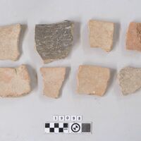 - Five rim fragments of deep bowls or basins with vertical walls. One of them has a black surface on the inside and a knob on the rim. The others have a pale pinkish surface.