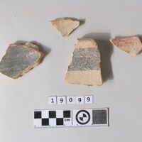 - Three loose sherds. One is a fragment of Protogeometric krater with brownish bands and concentric circles on the outside. It is painted black on the inside. Another one is a fragment of an open vase (LM III A kylix?). It has red oblique and horizontal parallel lines on the outside and is painted red on the inside. The third one is a rim fragment of a large