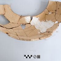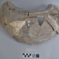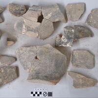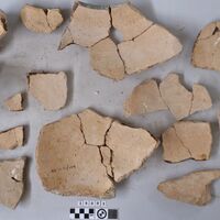- Several joining fragments of a large beak-spouted jug. Outward thickened rim. One vertical handle. Light-on-dark decoration on the outside.