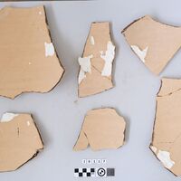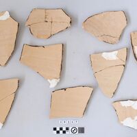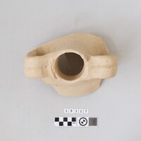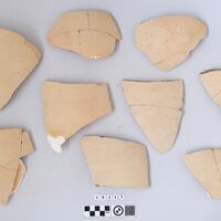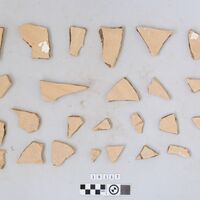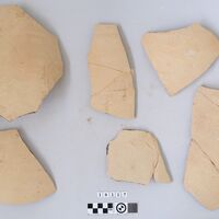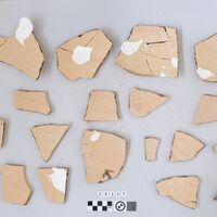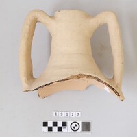 - Fifty-nine fragments of an amphora. Two bifid handles rising sharply to a peak level with the simple bead rim