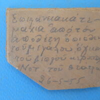 (= KNOSSOS RESTORATION - 26/5/55. SURFACE PIECES FROM REPOSITORY/DEPOSIT BEHIND PIECE OF DOUBLE AXE