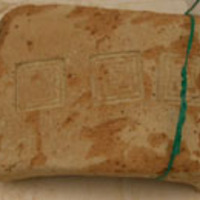 - Terracotta shape-large handle. Repeated decorative patterns impressed on the surface.