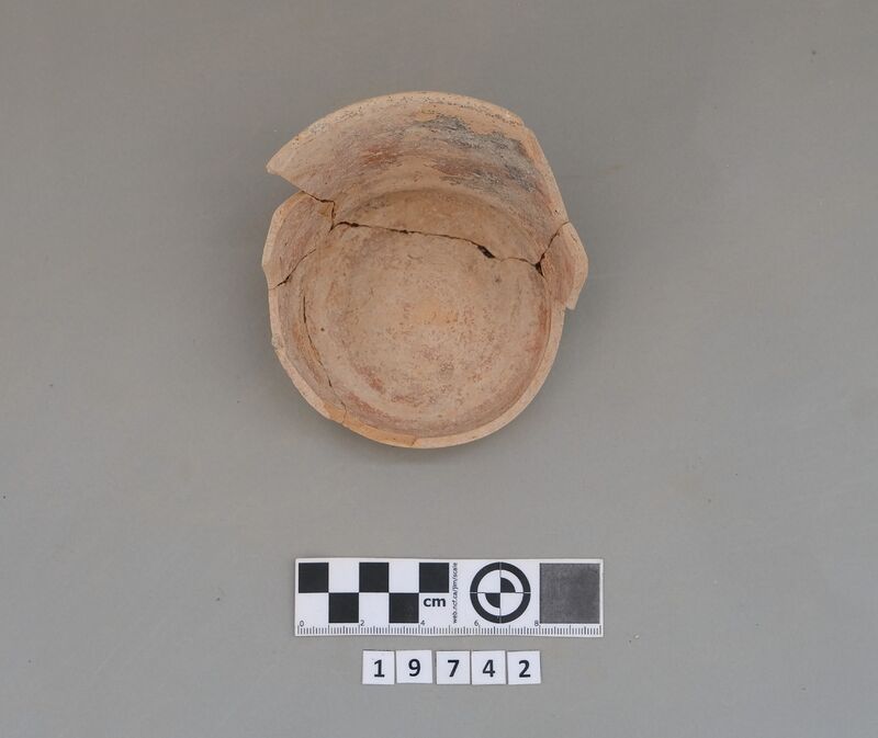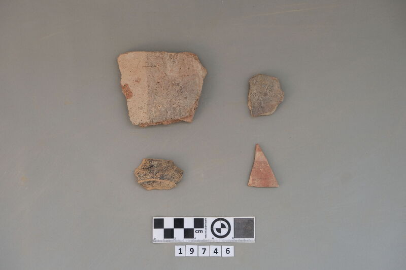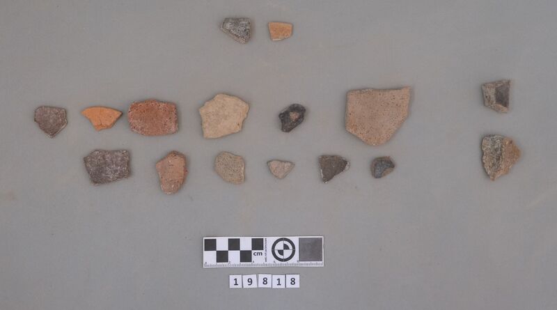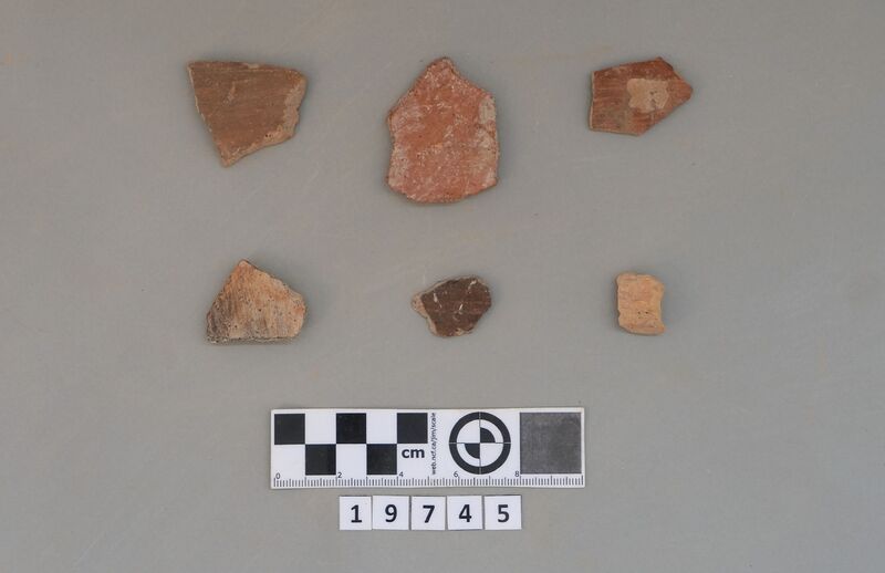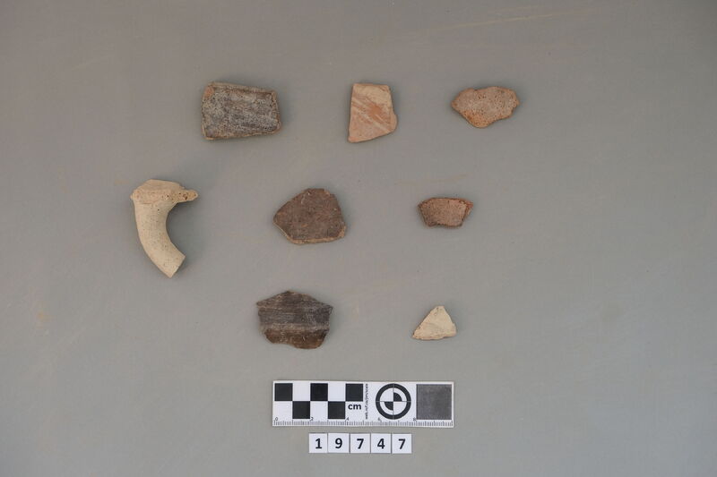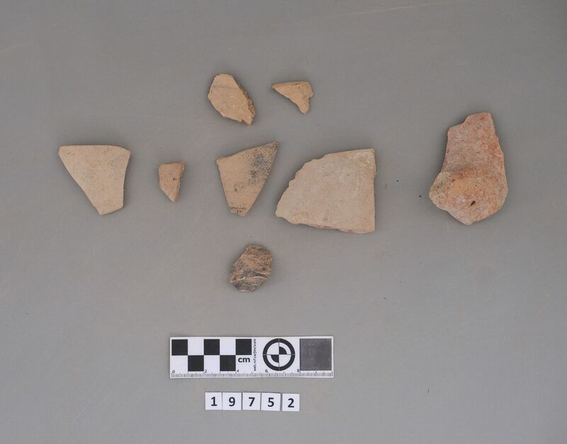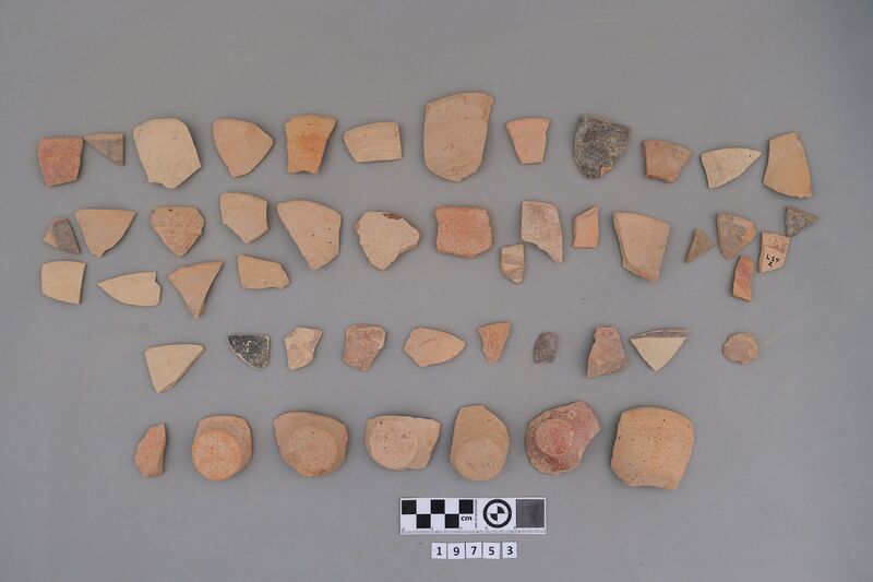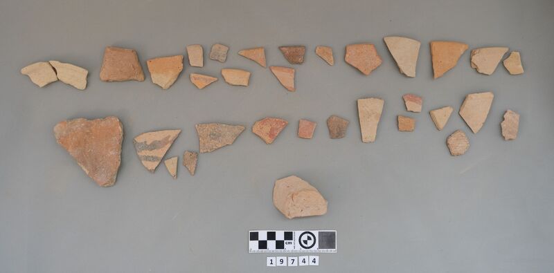 Sherds from various shapes including cups and jars. Some decorated with dark monochroe paint.