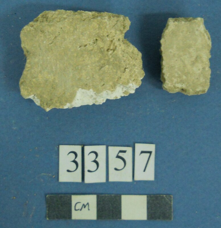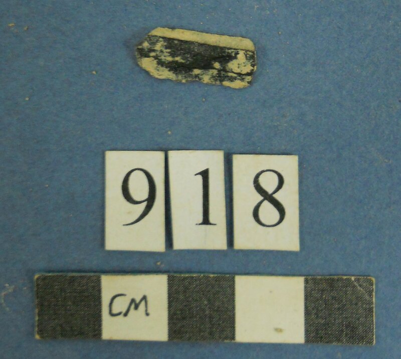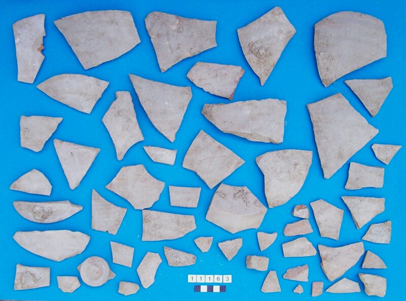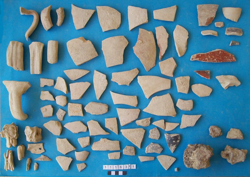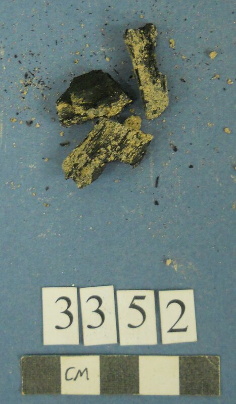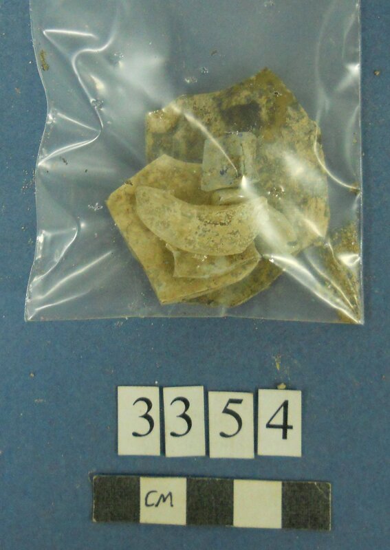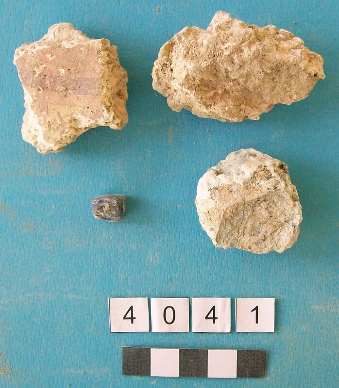 Fragments from at least 3 different vessels. 1 opaque blue tessera