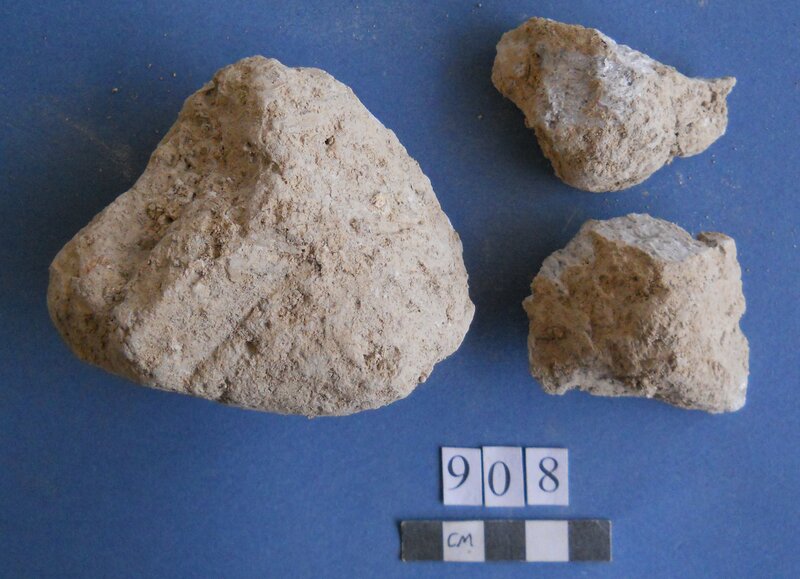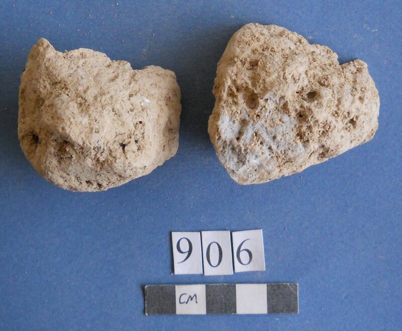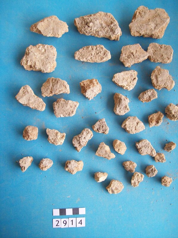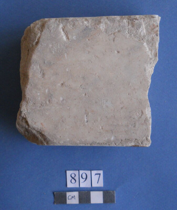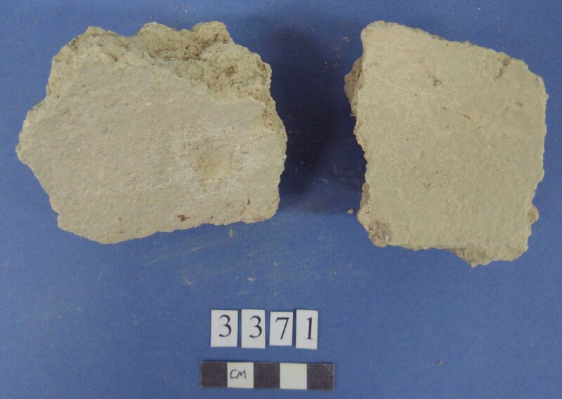 Few. Traces of pink-red pigment on surface. Construction plaster