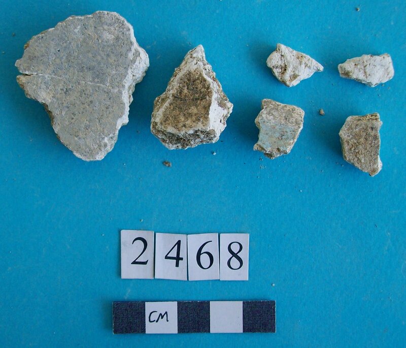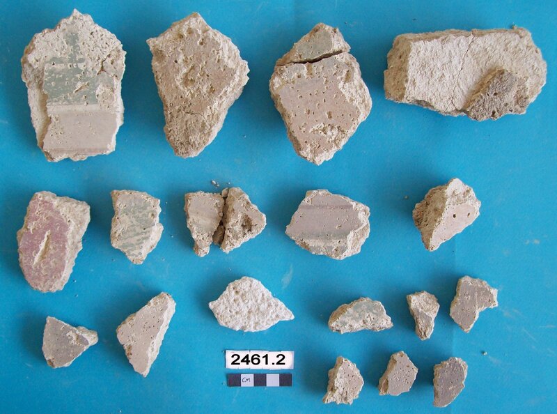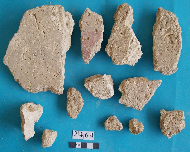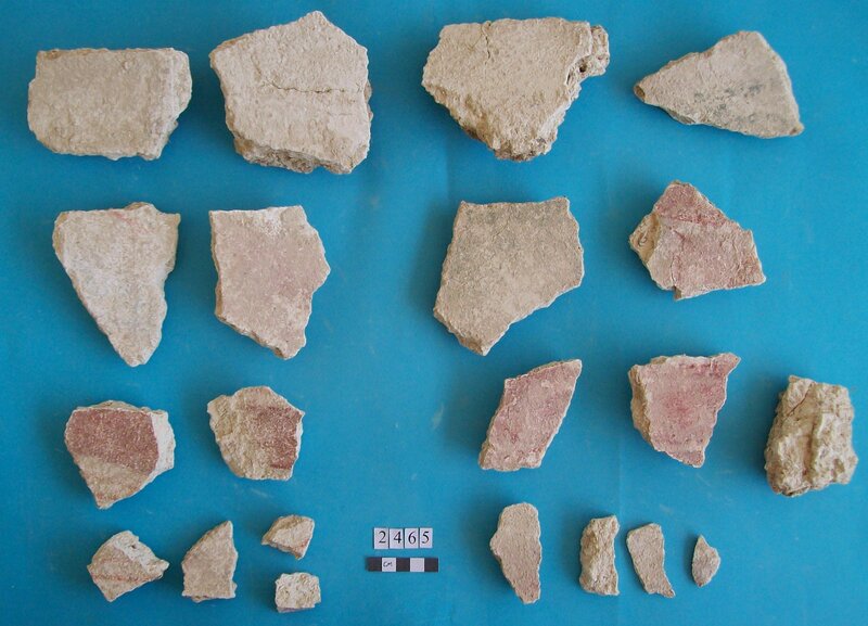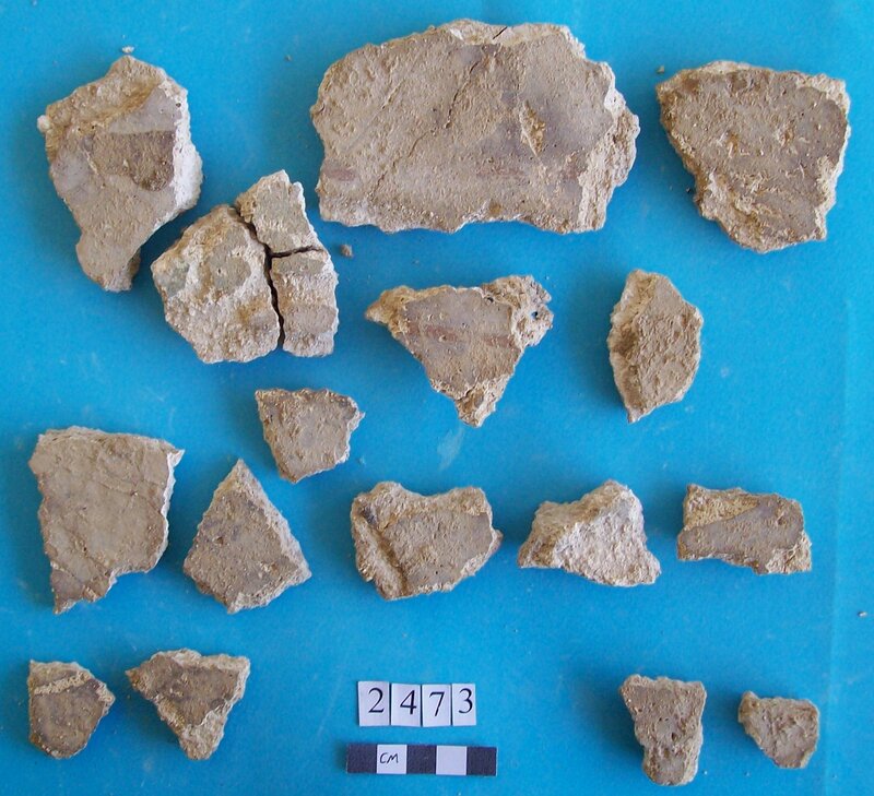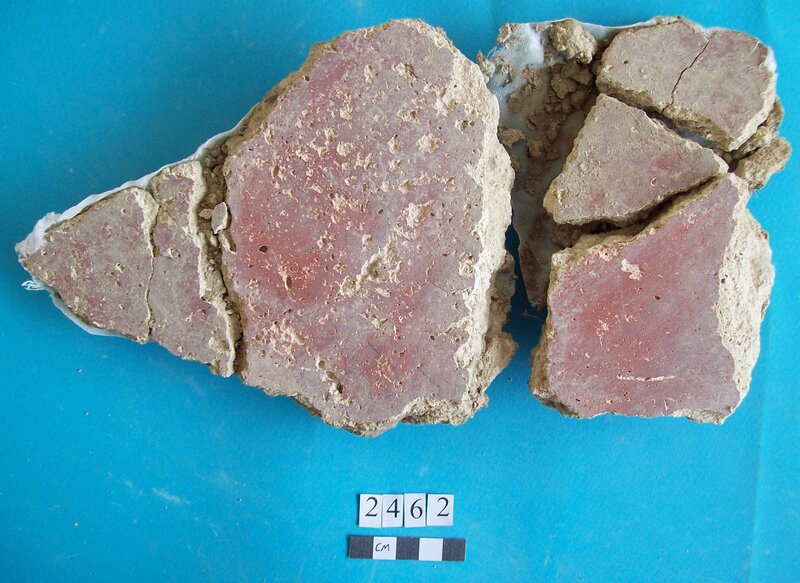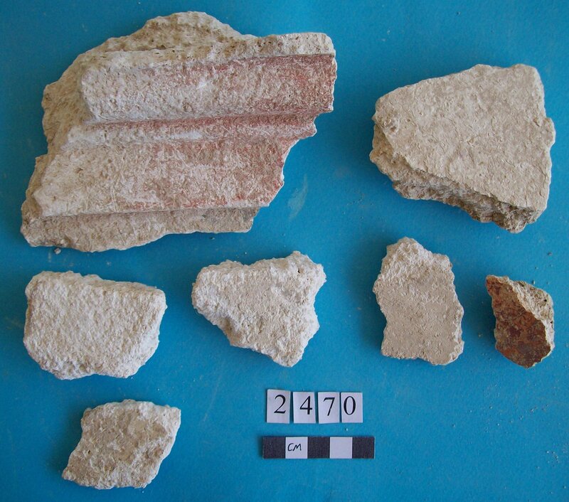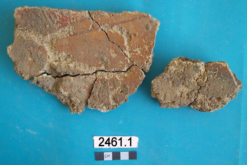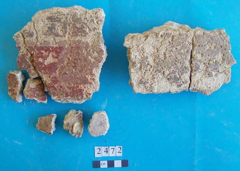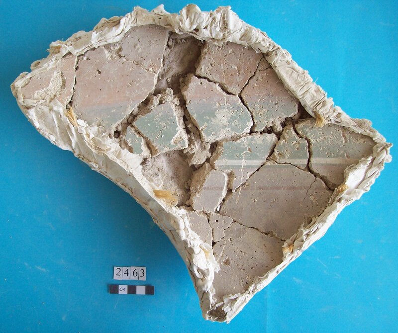 Large fragment still on gauze from excavation. Polychrome band decoration