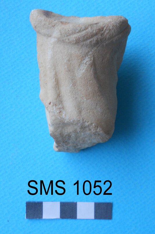 Seated (?) female figurine; 1 leg bent and drapery between legs