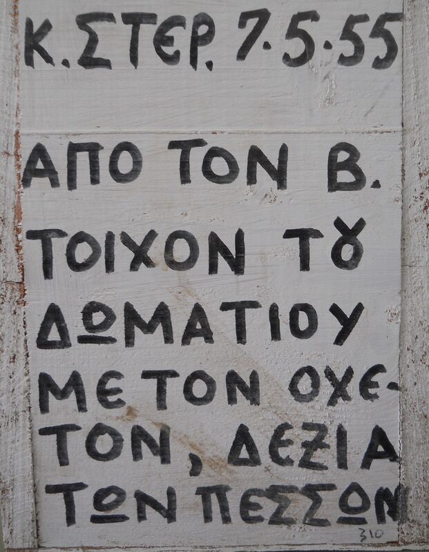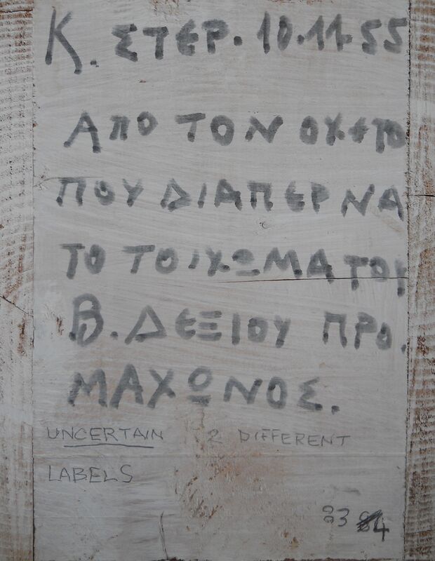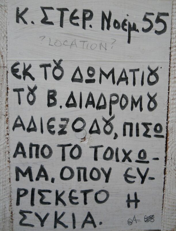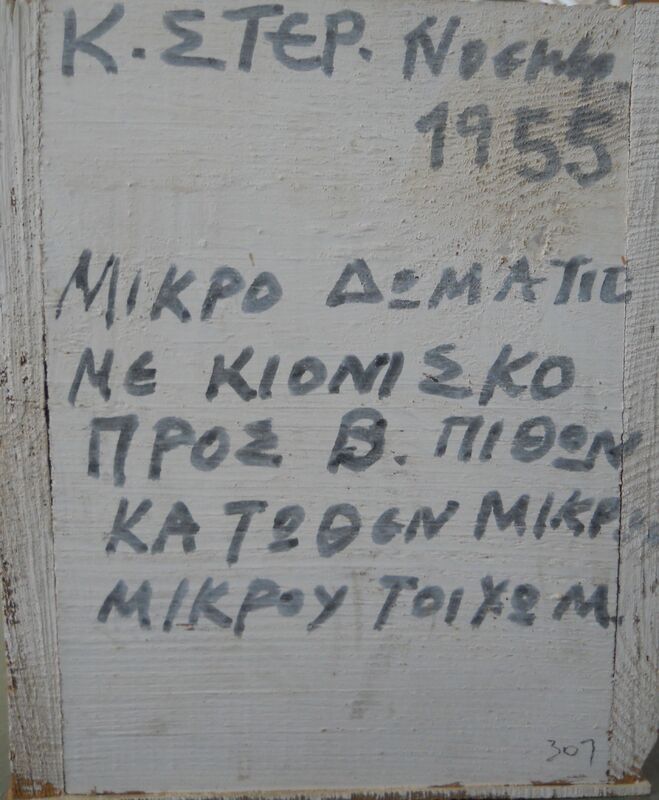 Κ.ΣΤΕΡ. ΝΟΕΜΒ. 55 ?LOCATION? (in pencil) ΕΚ ΤΟΥ ΔΩΜΑΤΙΟΥ ΤΟΥ Β. ΔΙΑΔΡΟΜΟΥ ΑΔΙΕΞΟΔΟΥ ΠΙΣΩ ΑΠΟ ΤΟ ΤΟΙΧΩΜΑ