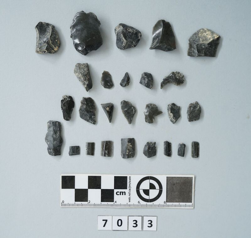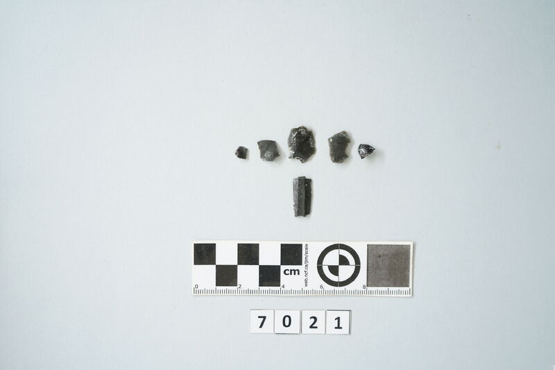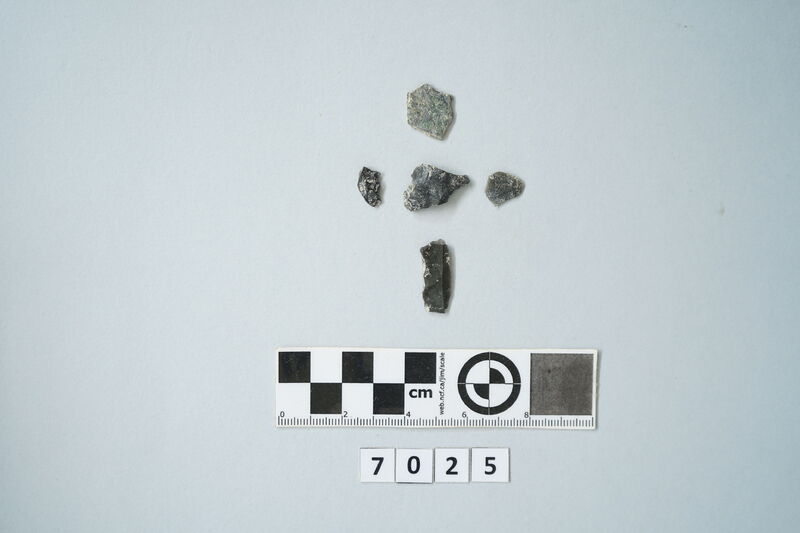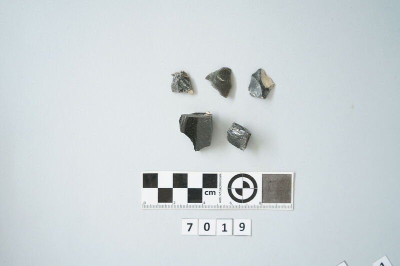 Five obsidian fragments of various sizes.