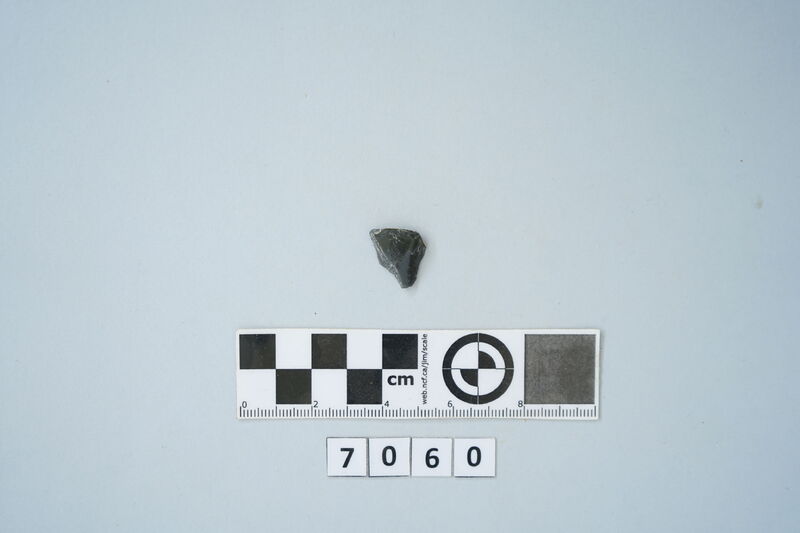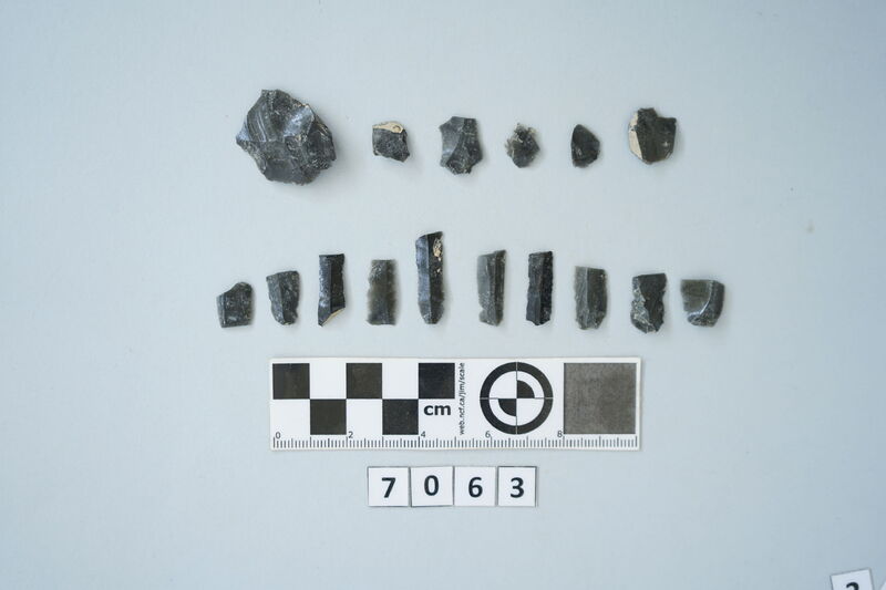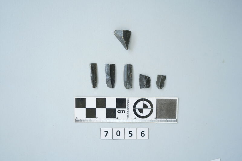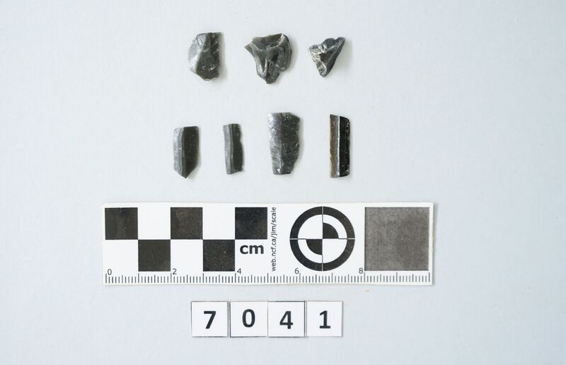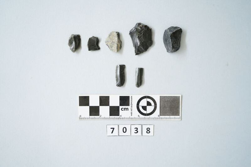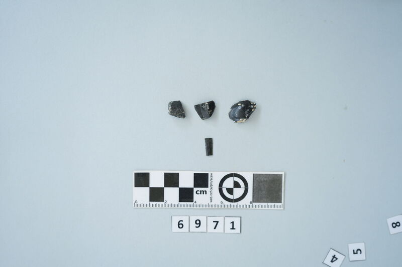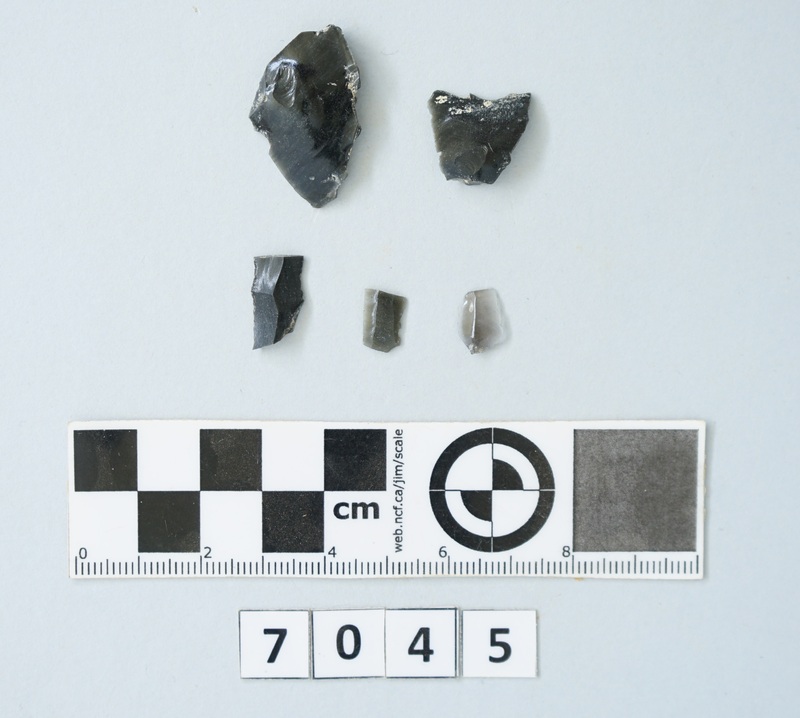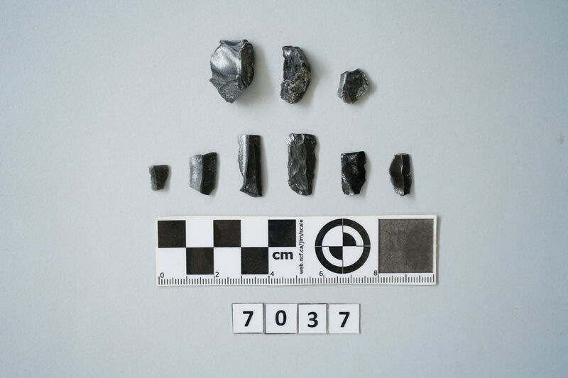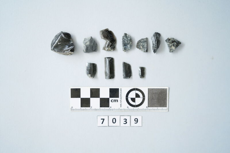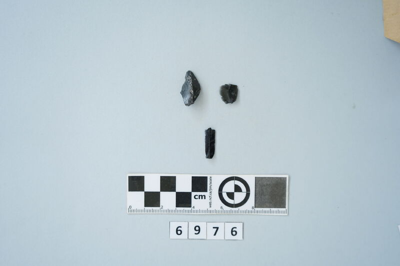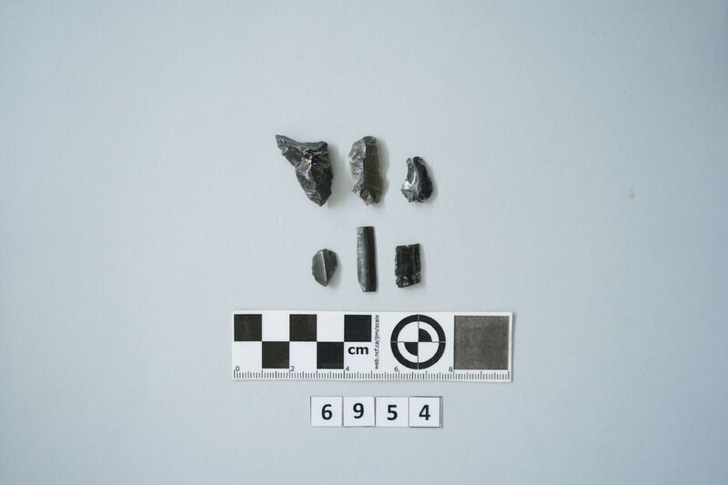 Five flakes and four big fragments of obsidian. Also six prismatic blades
