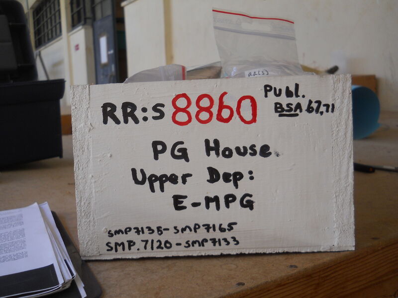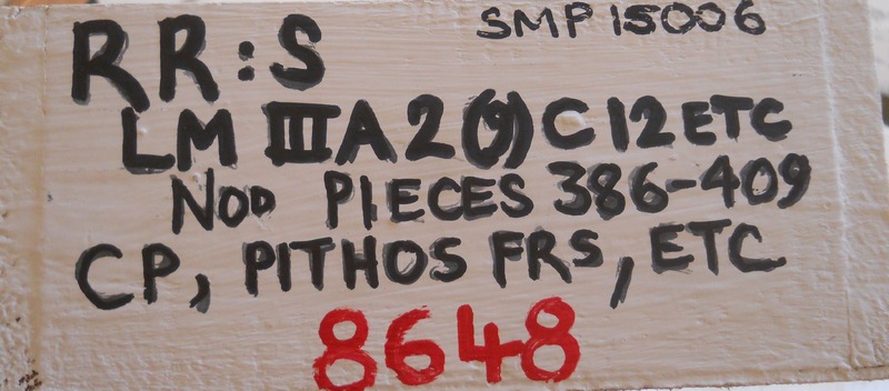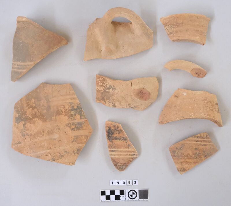 Three fragments of stone vessel or tools. One probably belonged to a whetstone. Another one is a handle fragment of a vase and has a groove in the middle. The third one is unidentified.