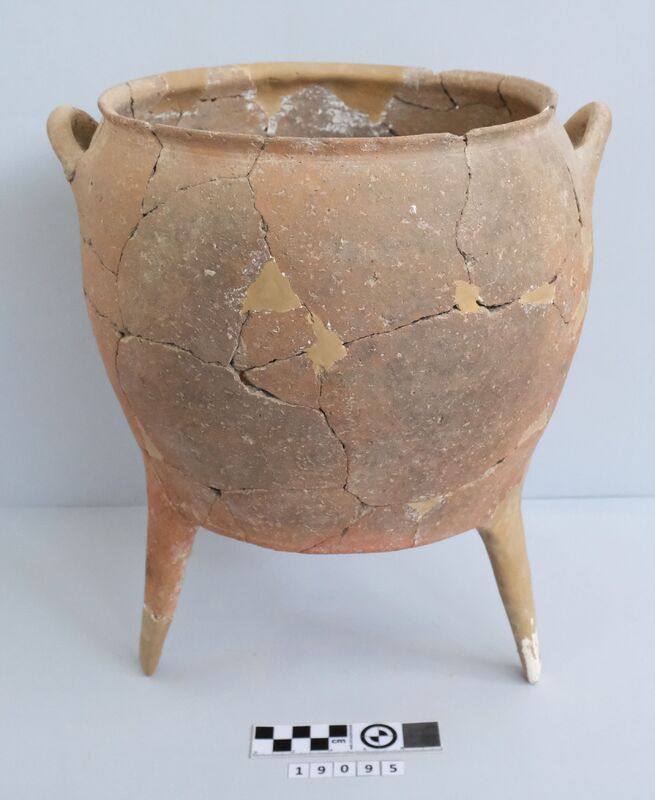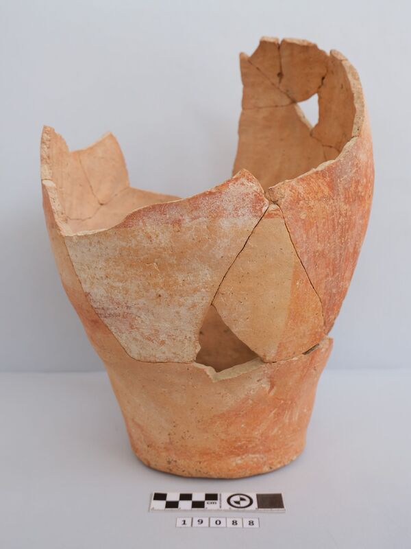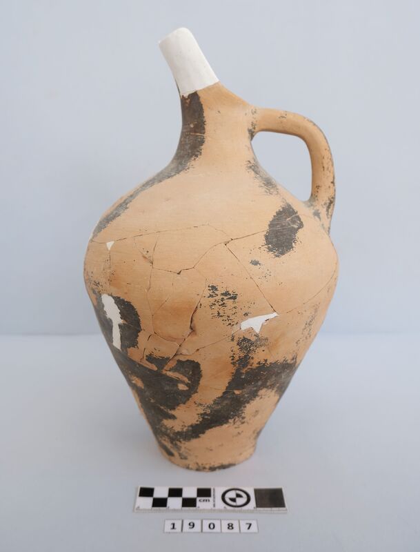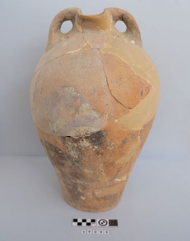 Half-preserved oval-mouthed amphora. Rim partly broken. A small handle attached on the lower part of the body. Red-brown coating on the outside and on the inner part of the neck. Burning traces on the interior.