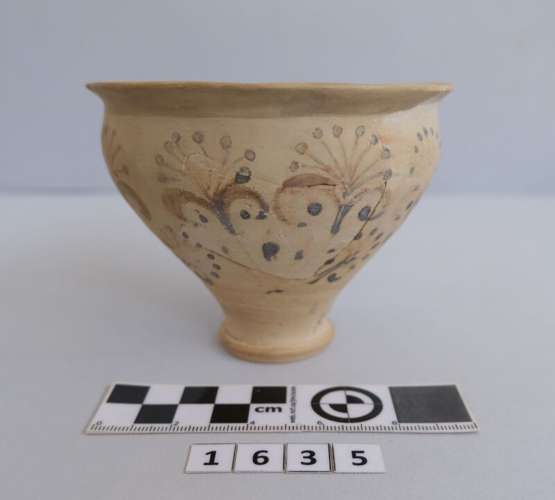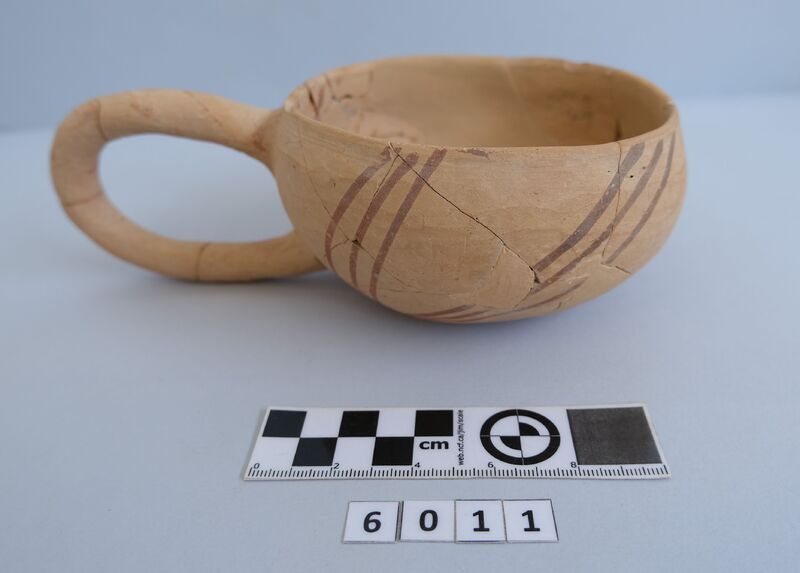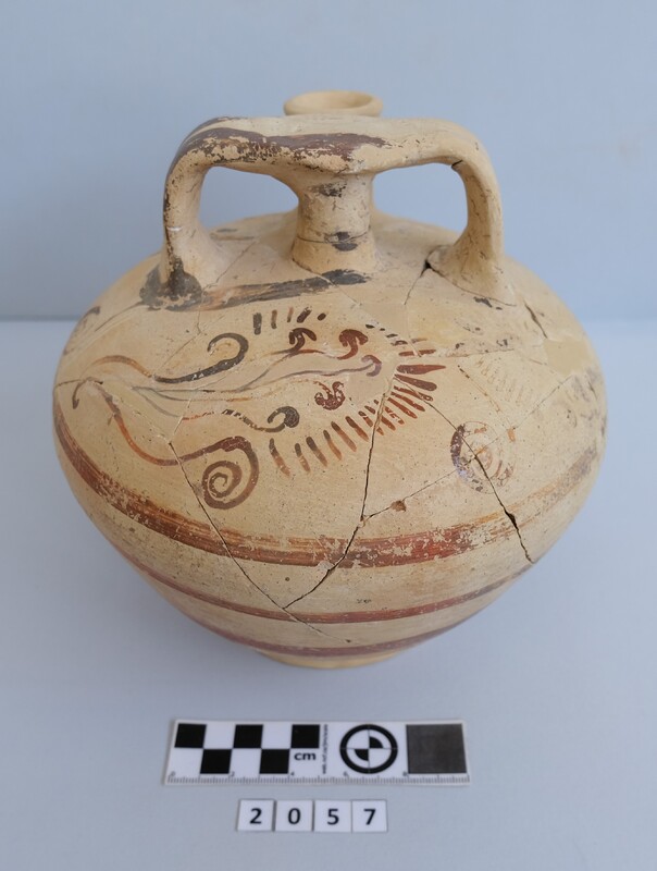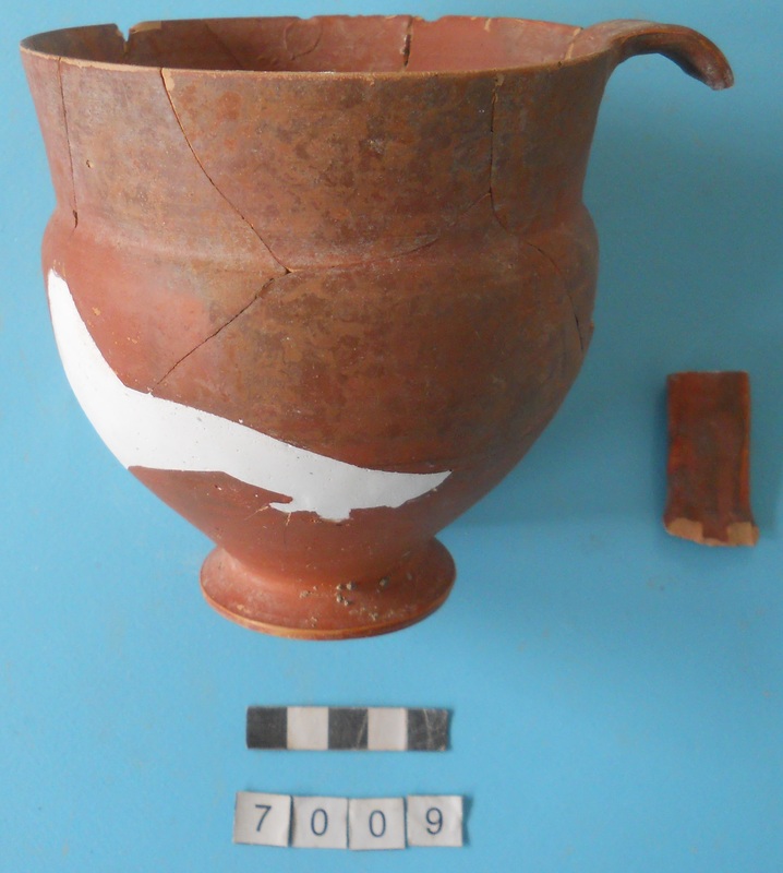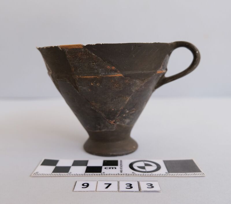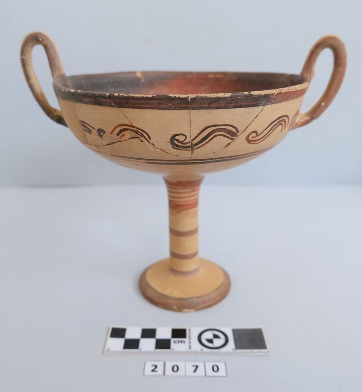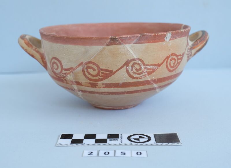 Kylix with two roll handles rising above the rim. Partly recomposed. Solid red to brown paint on the inside. Shallow rounded bowl with no marked lip. Red bands on stem. Multiple red stemmed spirals on the body. Handles painted with reserved stripe. One loose sherd.