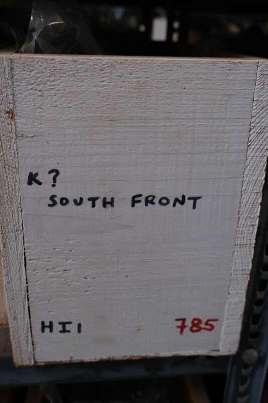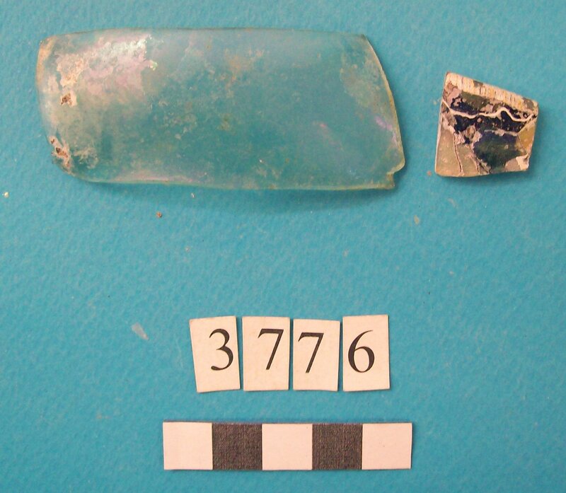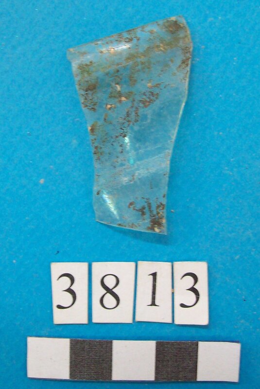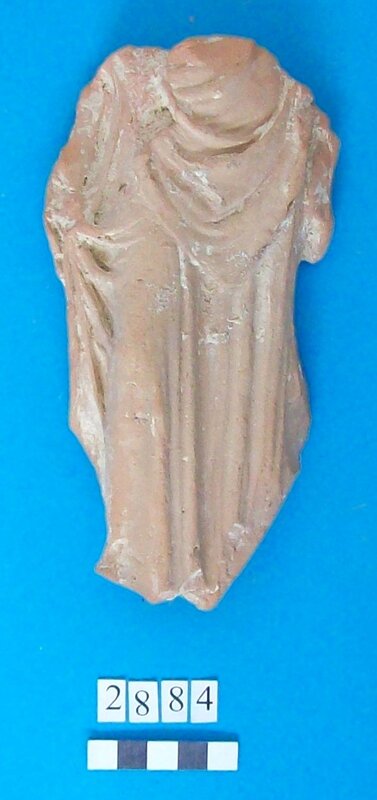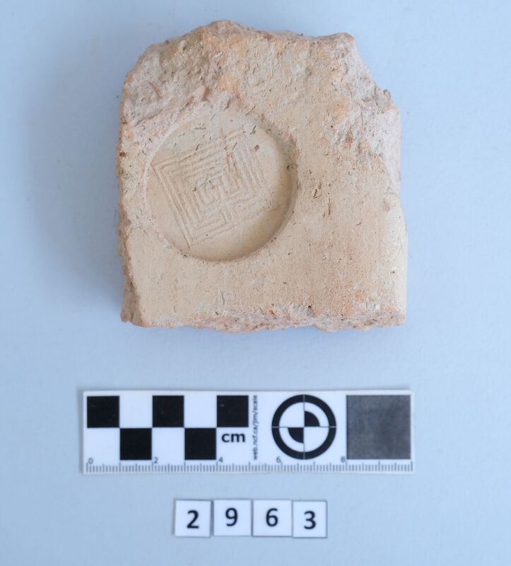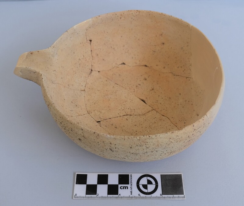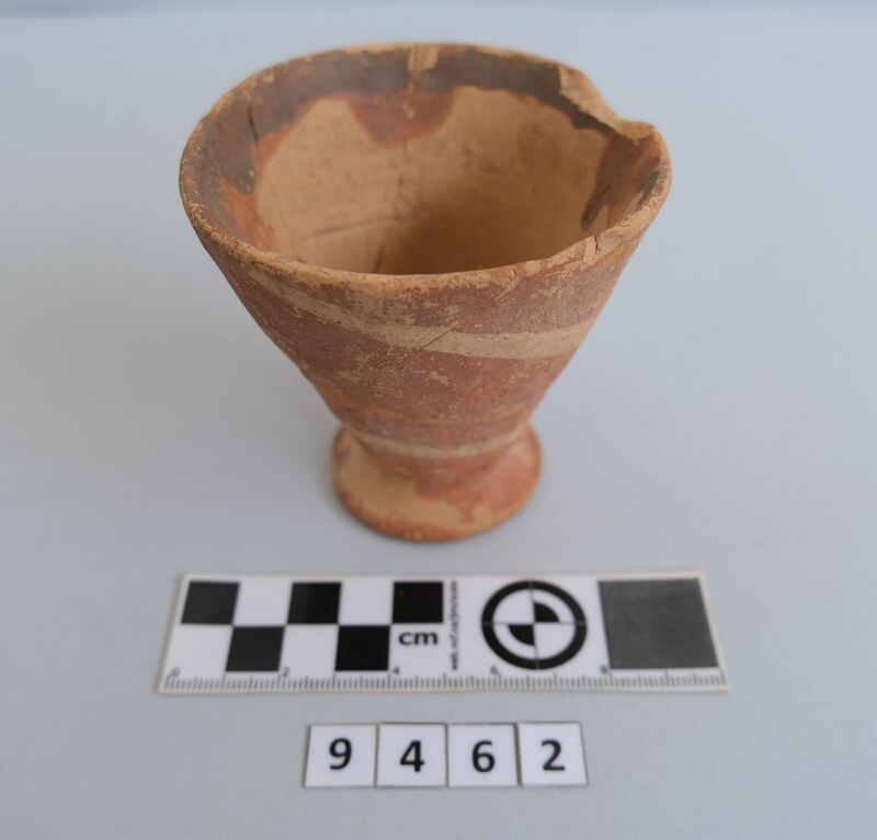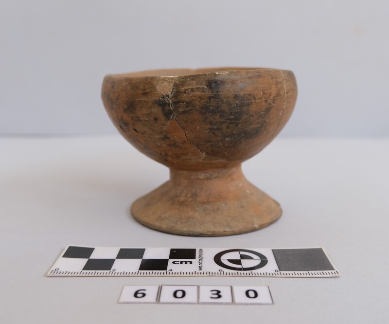 Kylix with two roll handles rising above the rim. Partly recomposed. Solid red to brown paint on the inside. Shallow rounded bowl with no marked lip. Red bands on stem. Multiple red stemmed spirals on the body. Handles painted with reserved stripe. One loose sherd.