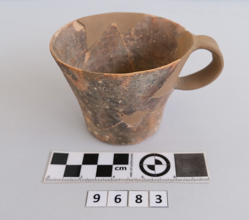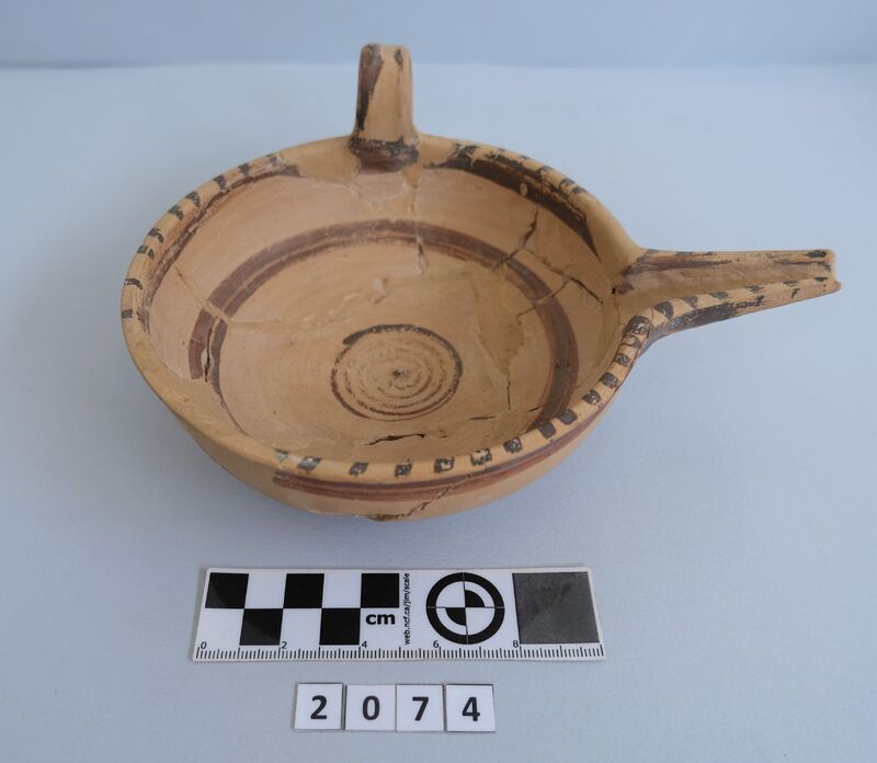 Few small rim and side fragments and upper part of handle missing. Restored. Coated dark-brown throughout. Exterior has careful white spotting on side and underside. H.7cm; D. rim: 9.5cm; D. base: 5.4cm.
