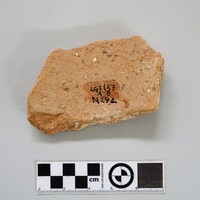 - Fragment of body of jar in coarse fabric. Running spiral painted in red on the outside.