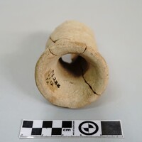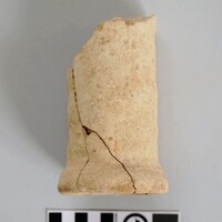 - Squat pedestal in semi-fine reddish fabric with flaring base and conical body. Walls are thick and roughly smoothed