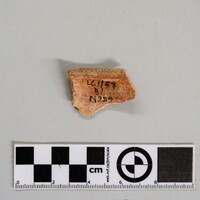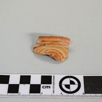 - Sherd of bowl with outturned rim. Three parallel bands painted in red on the exterior rim. Upper part of a spiral painted in red touching the rim.