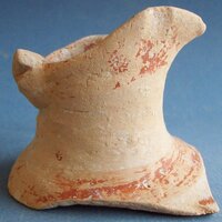 - buff clay. Red decoration: rim band and trickle on interior. Rim band and lower neck band on exterior