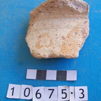 - palace style jar. Pink semi-coarse clay. Cream slip. Prange decoration: band and row of quirks on upper face