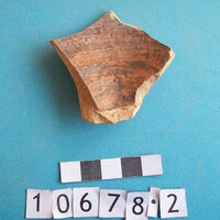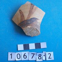 - pink-buff clay. Brown lustrous paint: solid interior; exterior with band at base and reed sprays.