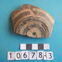 - grey core and red towards surface. Cream slip and black paint: interior has bands and wavy line; exterior has bands; spiral on base