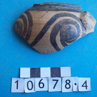 - pink buff clay. Black lustrous paint: rim band and spirals; upper face of handle solid