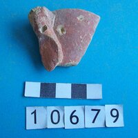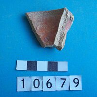 - one handled cup. Buff fine clay. Red paint: solid interior and exterior.