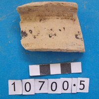 - pink-cream clay. Black paint (very faded): interior rim band; exterior rim band and floral patterns on neck; wavy pattern on rim.