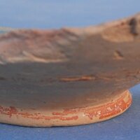 - pink-buff clay. Hard-fired. Cream slip and red paint on exterior. Narrow bands at base and lower body