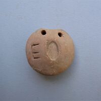 - with a deeply incised E to the left. Double perforations at the top. This loomweight is slightly chipped.