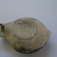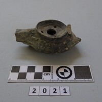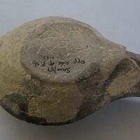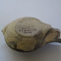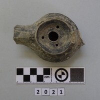 - one big oil hole in the middle of discus and three more air holes around. Relief garland decoration on the upper wall all around the discus. Inscription on the base DEMET-. Black slip on the exterior surface.