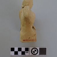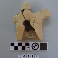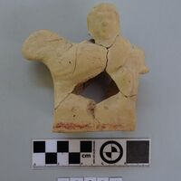- Incomplete hollow figurine with rectangular base representing male figure carrying sheep/lamb? Hole in back for suspending. Traces of red paint along bottom.