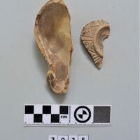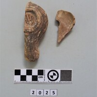 - Two fragments composing approximately half the lamp. Nozzle almost complete. Oil hole in the center of the discus. Two circular lines on the shoulder. Upper part of the body decorated with engraved geometric motifs. Ring base lightly concave. Other joining fragment in box SAN 6475 (SML2023).