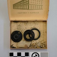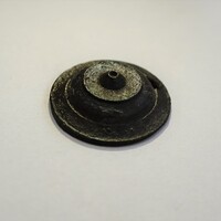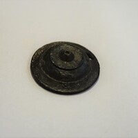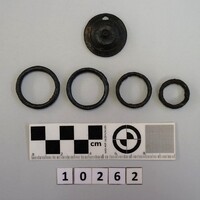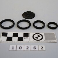 - Bone fragment with traces of gold leaf decoration. Front of bronze bossed brooch or other ornament. Bronze rings of different sizes. Small bronze fragments.