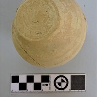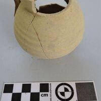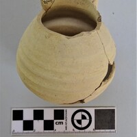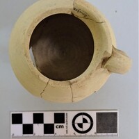 - handle extant. Rim straight and concave. Wheel traces on body. One loose fragment.