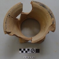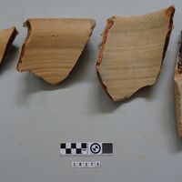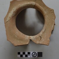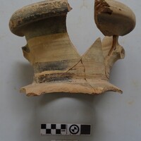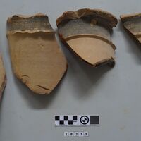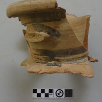 joining fragments of long-necked amphora. Two preserve flatish projecting rim with black slip band on upper neck. Other joining fragment is neck.
