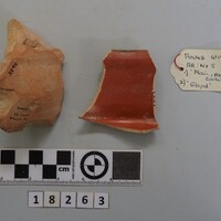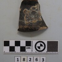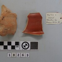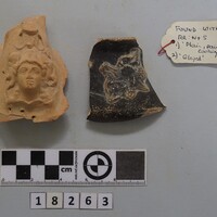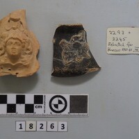 Fragment of thin-walled bowl. Interior: red slip. Upper surface of rim and exterior: black slip. On middle of surviving wall cornucopia and grapes(?)