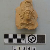 Handle attachment of large pot/jar with applique representation of bust (head and neck). Female wearing helmet with vegetative design. Hellenistic style.