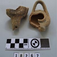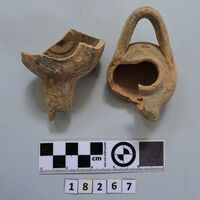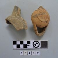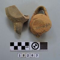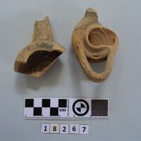 - two lamps and one pyramidal clay object. Four fragments joining. Several fragments black slipped. Hellenistic?