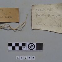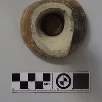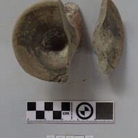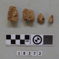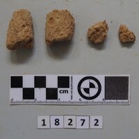 In same box - four fragments of small cylindrical clay object with hollowed centre.