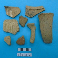- and plain and painted medium wares. Featuring black wash decoration. Brown slip on buff. Trickles of white. Incised vertical hatching. Includes a handle sherd with a decorative clay knob.